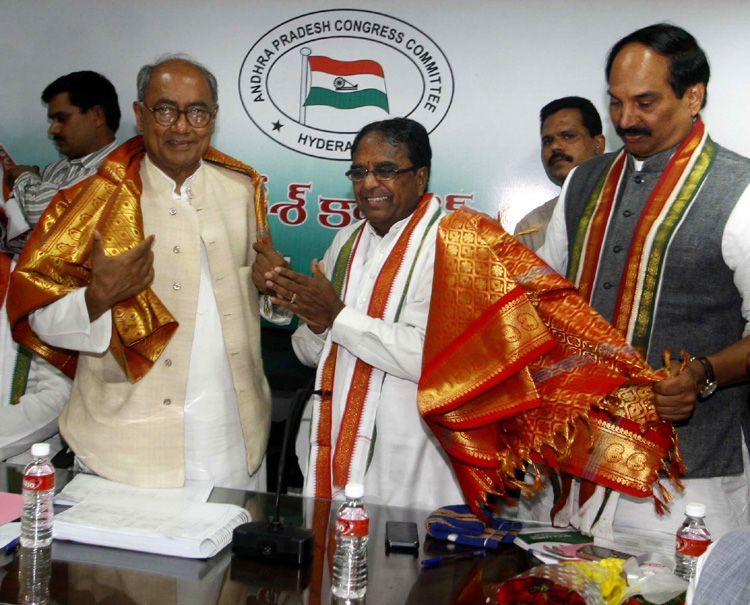 AICC secretearay general and incharge of AP party affairs Digvijay Singh, newly appointed Telangana PCC president Ponnala Lakshmaiah, working president Uttam Kumar Reddy being felicitated by party workers at Gandhi Bhavan on Thursday in Hyderabad.