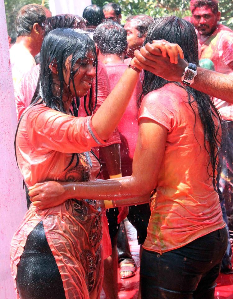 Holi revellers participate in a rain dance on the eve of Holi in Hyderabad.