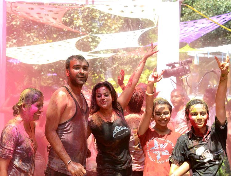 Holi revellers participate in a rain dance on the eve of Holi in Hyderabad.