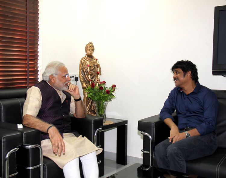 Actor Akkineni Nagarjuna met BJP prime minister candidate Narendra Modi today at Gandhinagar in Gujrat. Both discussed prevailing political conditions in the country and AP in their hour long meeting.