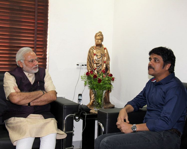 Actor Akkineni Nagarjuna met BJP prime minister candidate Narendra Modi today at Gandhinagar in Gujrat. Both discussed prevailing political conditions in the country and AP in their hour long meeting.