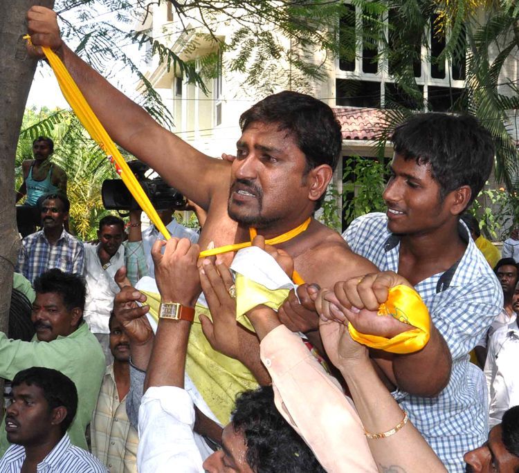 A TDP activist protesting against the BJP-TDP poll allaince threatening to hang himself at Chandrababu Naidu residence here in Jubilee Hills.