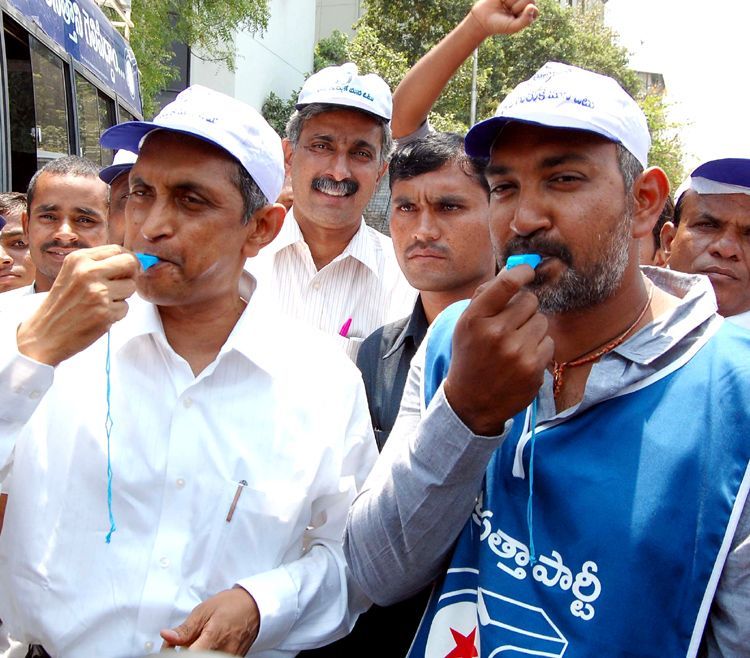 Lok Satta president Jayaprakash Narayan along with film director SS Rajamouli blowing whistle (LS poll symbol) after filing nomination for Malkajigiri LS seat.