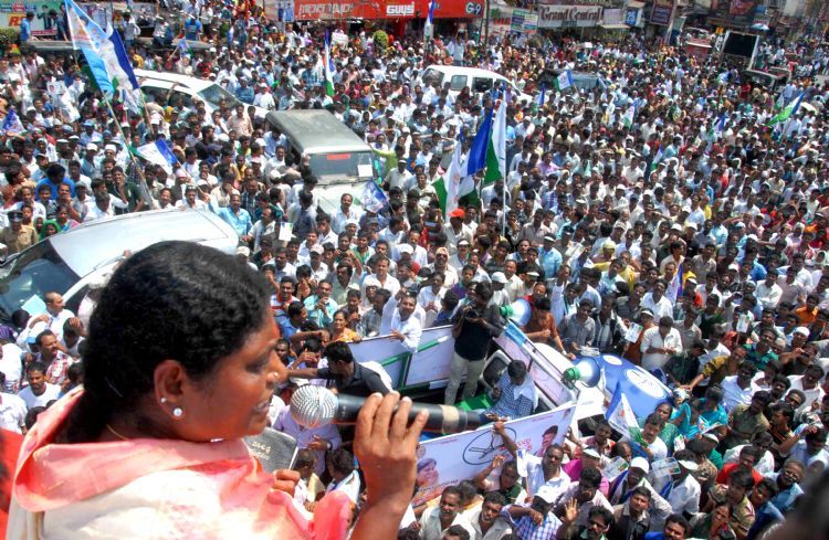 YSRCP hon. president Smt. YS Vijayamma addressing a huge gathering of party activists at Jagadamba Center in Visakhapatnam. She, accompanied by her daughter Smt Sharmila, has filed her nomination papers for Visakhapatnam Lok Sabha seat on Thursday.