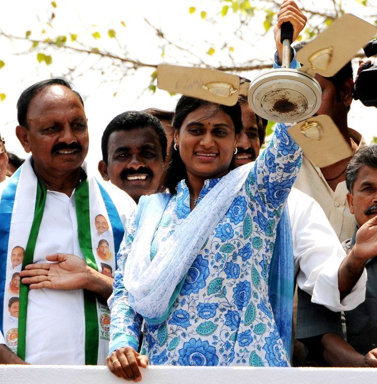 Sharmila addressing a public meeting in Neredcherla of Nalgonda dist. on Friday as part of election campaign on behalf of YSRCP.