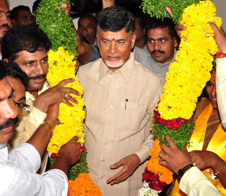 TDP president N Chandrababu Naidu being garlanded by party leaders in Chirala on the eve of his 65th birthday on Sunday.