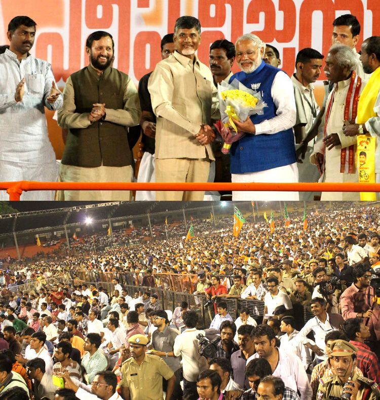 BJP prime minister nominee Narendra Modi, TDP president N Chandrababu Naidu, actor, Jenasena chief Pawan Kalyan participated in a joint public meeting held in LB Stadium in Hyderabad on Tuesday.