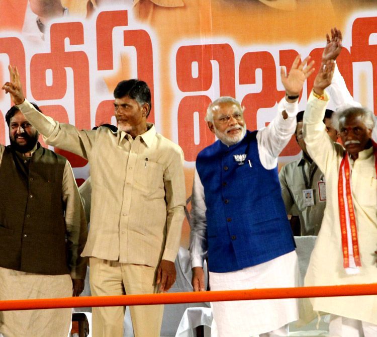 BJP prime minister nominee Narendra Modi, TDP president N Chandrababu Naidu, actor, Jenasena chief Pawan Kalyan participated in a joint public meeting held in LB Stadium in Hyderabad on Tuesday.