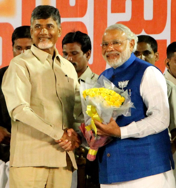 BJP prime minister nominee Narendra Modi, TDP president N Chandrababu Naidu, actor, Jenasena chief Pawan Kalyan participated in a joint public meeting held in LB Stadium in Hyderabad on Tuesday.