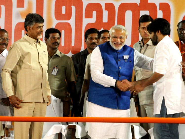 BJP prime minister nominee Narendra Modi, TDP president N Chandrababu Naidu, actor, Jenasena chief Pawan Kalyan participated in a joint public meeting held in LB Stadium in Hyderabad on Tuesday.