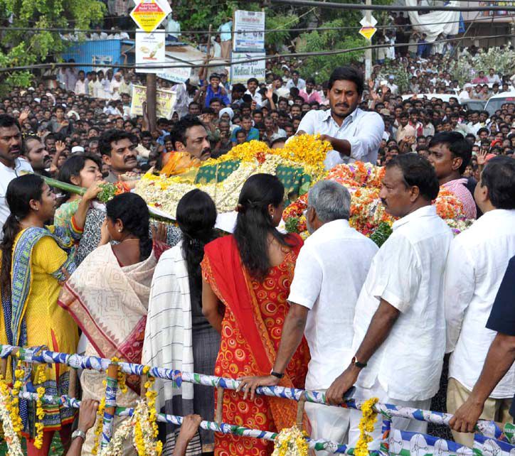 YSRC president YS Jaganmohan Reddy paying floral tributes to departed leader Sobha Nagi Reddy before her funerals at Allagadda in Kurnool district on Friday.