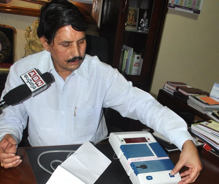 Chief Election Officer of Andhra Pradesh Bhanwarlal showing how the working of an EVM functions to media persons at his office in Secretariat on Tuesday.
