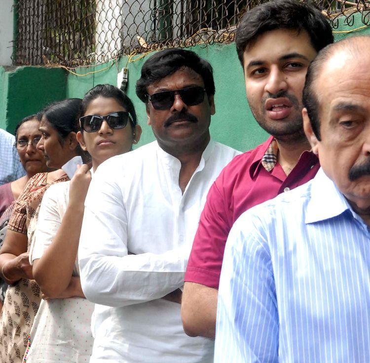 Union minister Chiranjeevi after being snubbed for jumping the que at a polling station in Jubilee Hills in Hyderabad is forced to stand in que waiting for his turn on Wednesday.