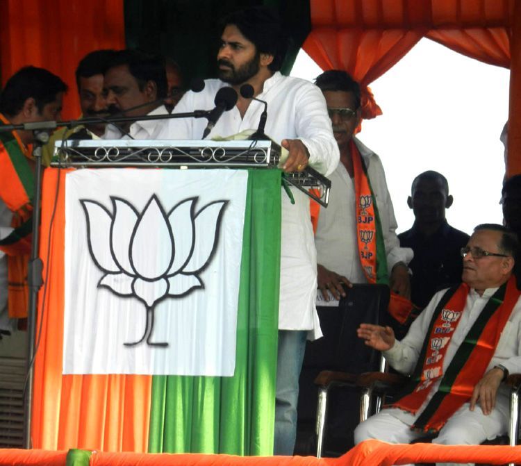 Actor and Janasena party founder Pawan Kalyan addressing a massive crowd at a joint public meeting of TDP-BJP held in Bheemavaram and attended by Narendra Modi and Chandrababu Naidu on Thursday.