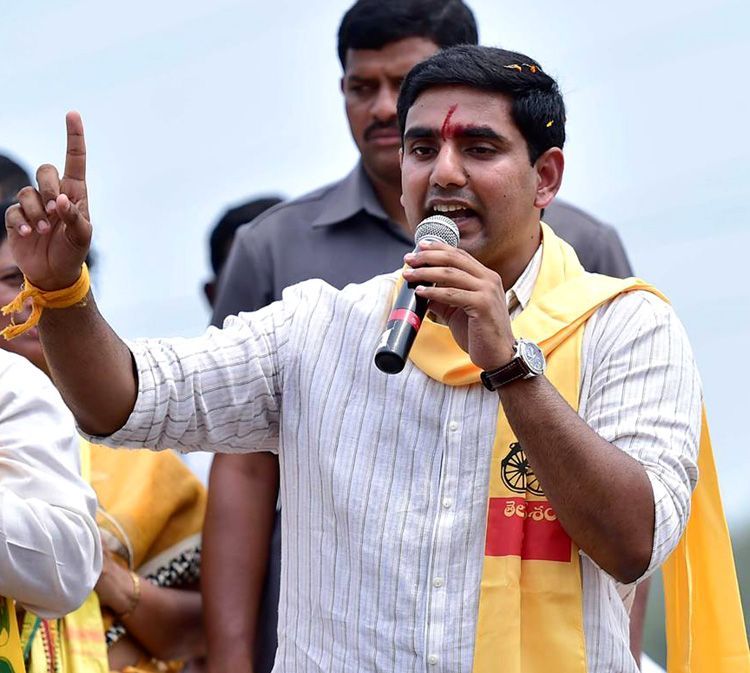 TDP chief Chandrababu Naidu's son Nara Lokesh addresses a public meeting during his road show in Araku of Visakhapatnam district.