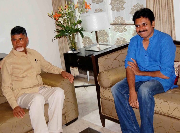 TDP president N Chandrababu Naidu with actor Pawan Kalyan at his residence in Jubilee Hills on Thursday. Naidu invited Pawan for lunch at his home.