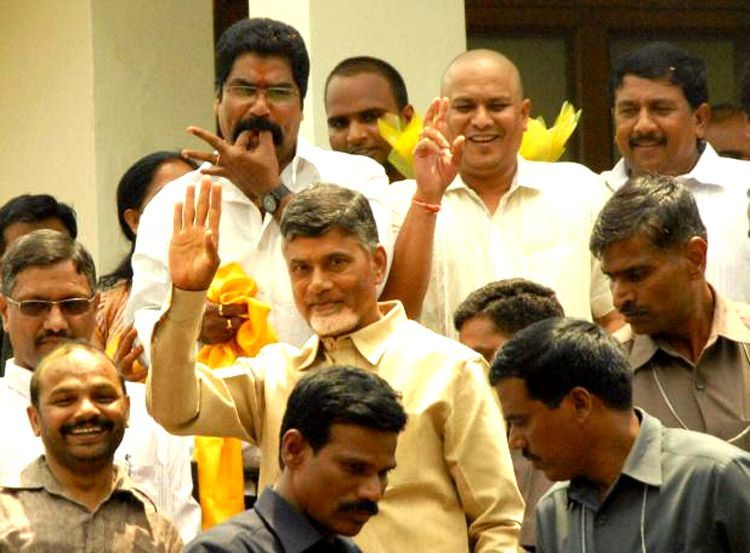 TDP President N. Chandababu Naidu greets his partymen following a good show in the Assembly and Parliament elections in Hyderabad on Friday.