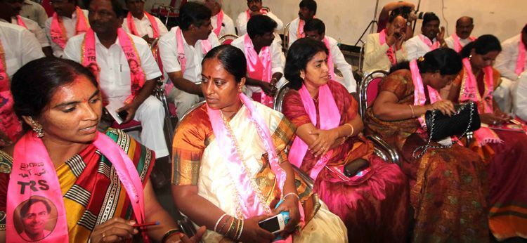 Kavita along with other women MLAs elected for Assembly cheers with party cadre at at Telangana Bhavan here on Saturday.