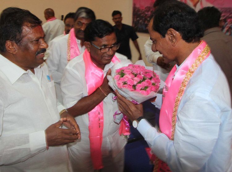 KCR being greeted by newly elected party MLAs and MPs on the eve of party's first legislature body meeting held at Telangana Bhavan here on Saturday.