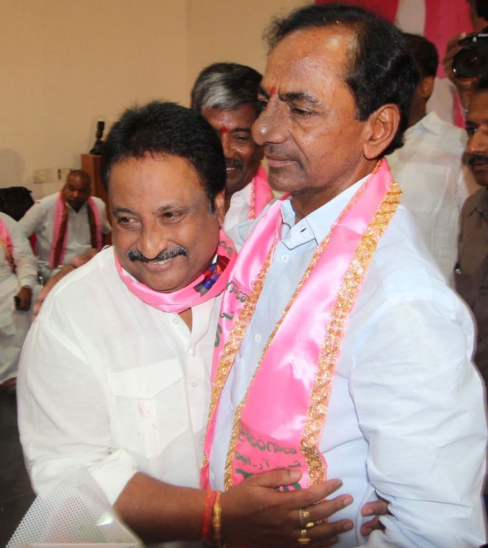 KCR being greeted by newly elected party MLAs and MPs on the eve of party's first legislature body meeting held at Telangana Bhavan here on Saturday.