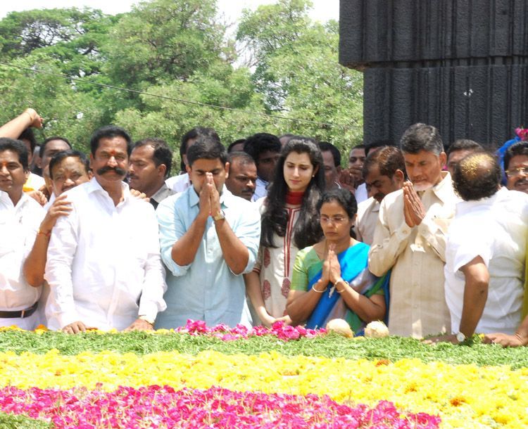 TDP president N. Chandrababu Naidu along with his wife Bhuvaneswari, son Nara Lokesh, daughter-in-law Brahmani and other party leaders paying floral tributes to late NTR on Saturday at NTR Ghat in Hyderabad on the eve of party returning to power after 10 years in AP.