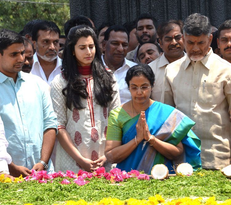 TDP president N. Chandrababu Naidu along with his wife Bhuvaneswari, son Nara Lokesh, daughter-in-law Brahmani and other party leaders paying floral tributes to late NTR on Saturday at NTR Ghat in Hyderabad on the eve of party returning to power after 10 years in AP.