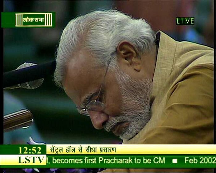 Prime Minister elect Narendra Modi gets emotional for a brief moment at NDA meeting in Delhi on Tuesday.