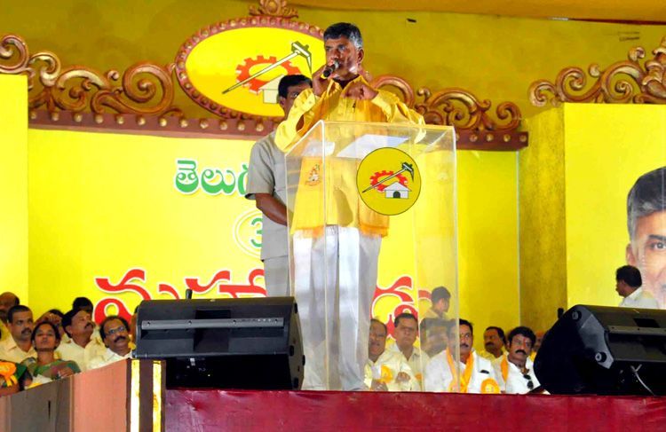 TDP supremo and Andhra Pradesh chief minister designate N Chandrababu Naidu at inauguration of party's two day enclave Mahanadu began at Gandipet in Hyderabad on Tuesday.