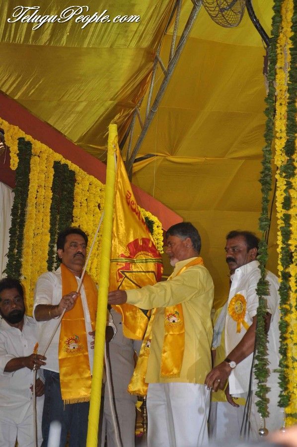 TDP supremo and Andhra Pradesh chief minister designate N Chandrababu Naidu at inauguration of party's two day enclave Mahanadu began at Gandipet in Hyderabad on Tuesday.