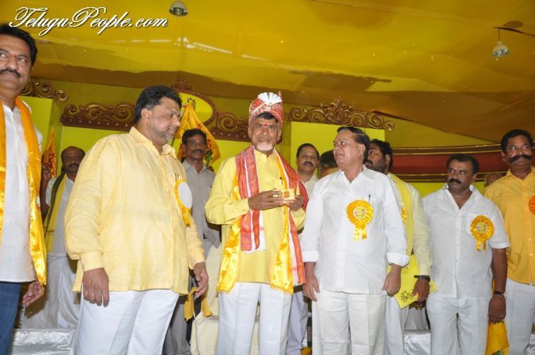 TDP supremo and Andhra Pradesh chief minister designate N Chandrababu Naidu at inauguration of party's two day enclave Mahanadu began at Gandipet in Hyderabad on Tuesday.