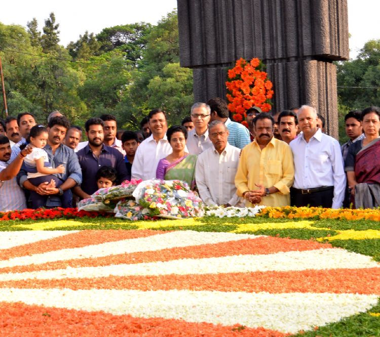 Nandamuri family members paying floral tributes to NT Rama Rao on the eve of his brith anniversary at NTR Ghat in Hyderabad on Wednesday.