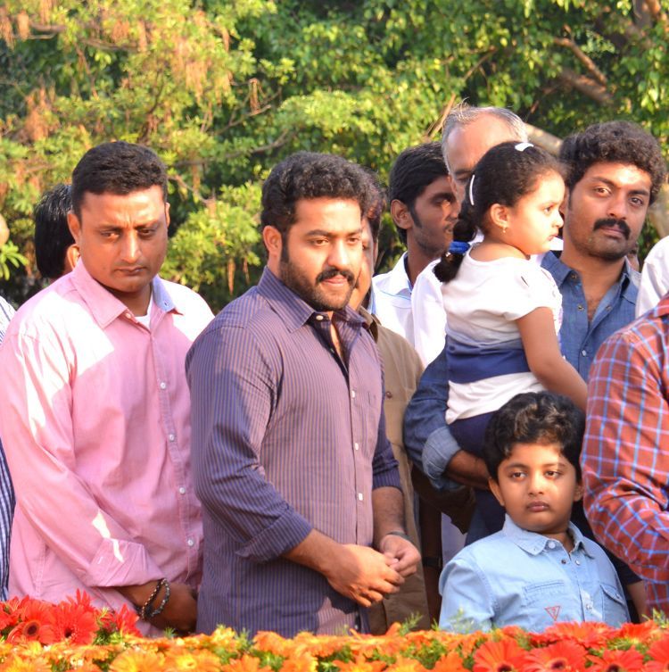 Nandamuri family members paying floral tributes to NT Rama Rao on the eve of his brith anniversary at NTR Ghat in Hyderabad on Wednesday.