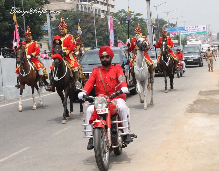 First Chief Minister of New State Telangana K Chandershekar Rao taking salute from police and armed reserve forces at a specially held parade at Parade Grounds in Secunderabad on Monday.