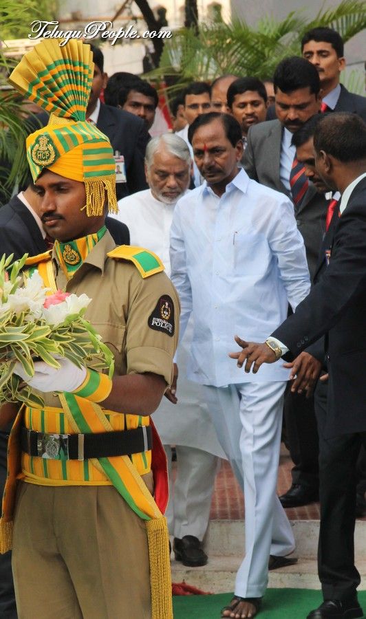 First Chief Minister of New State Telangana K Chandershekar Rao taking salute from police and armed reserve forces at a specially held parade at Parade Grounds in Secunderabad on Monday.