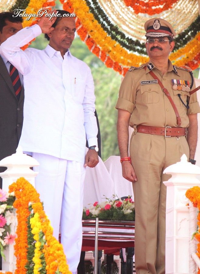First Chief Minister of New State Telangana K Chandershekar Rao taking salute from police and armed reserve forces at a specially held parade at Parade Grounds in Secunderabad on Monday.