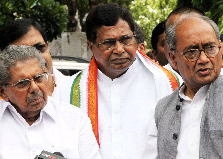 AICC observers Digvijay Singh, Vayalar Ravi with the newly elected Telangana CLP leader K Jana Reddy speaking to media at Gandhi Bhavan here on Tuesday.