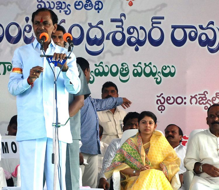 Telagnana chief minister K.Chandrasekhar Rao addressing a public meeting at Gajwel in Madak district on Wednesday. Home minister Nayani Narasimha Reddy, Medak district collector Smita Sabharwal also present.