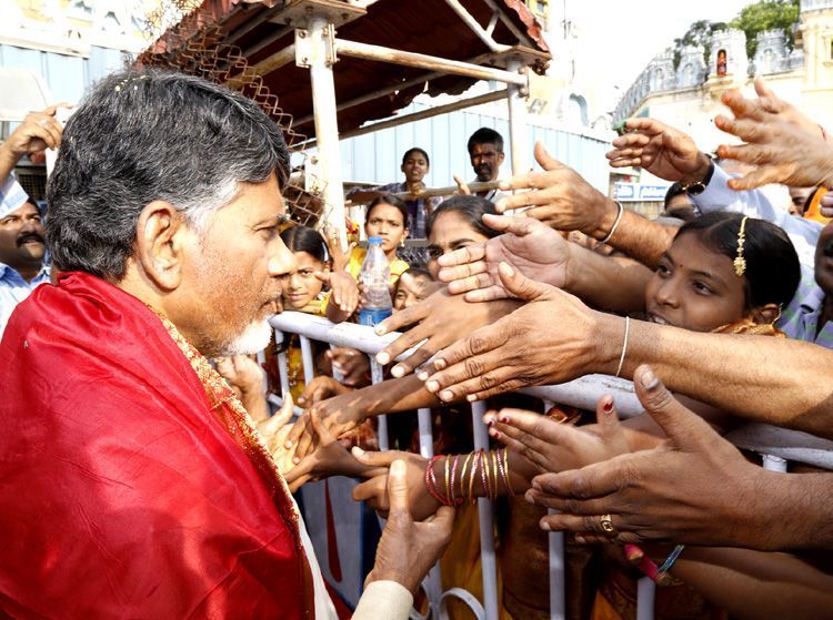 Piligrams waiting in Q lines throng Chief Minister designate of AP N Chandrababy Naidu to get a hand shake with him at Tirumala on Thursday. Naidu interacts with devotees and inquired about facilities in Tirumala.