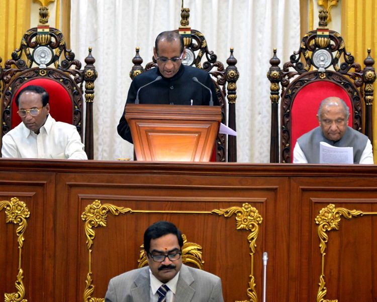 Governor of AP ESL Narasimhan addresses the joint house of AP legislature in Assembly hall on Saturday as Speaker of Assembly Kodela Siva Prasad and Chairman of council Chakrapani sat beside him.