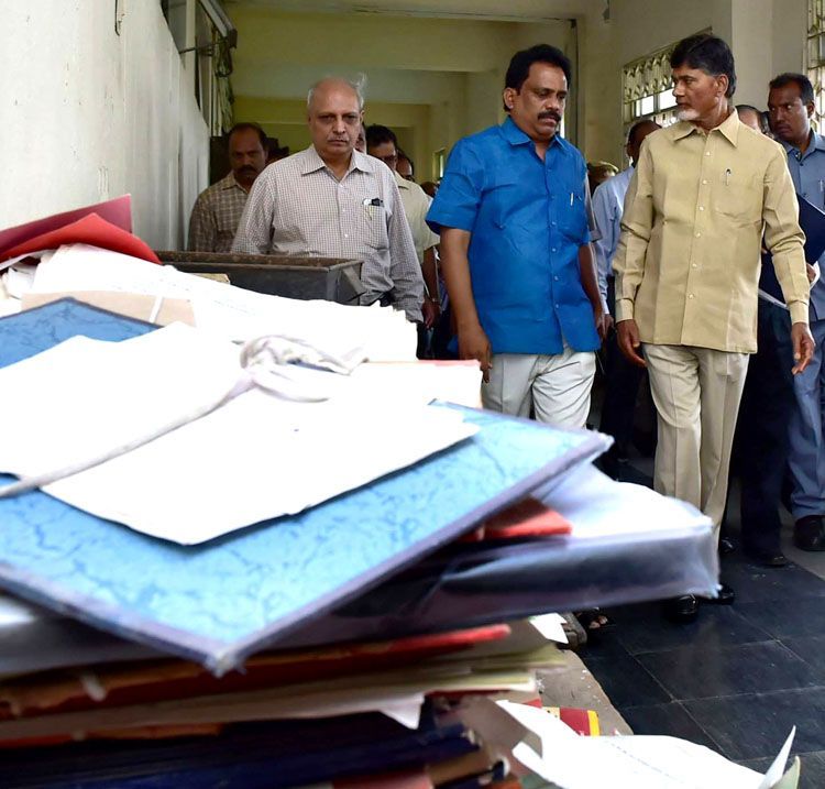 Chief Minister Chandrababu Naidu Friday took a stroll through rooms allotted for AP in L and J bloocks of the Secretariat. The place looks pretty much like a garbage dump or a set for one of Ram Gopal Varma’s fight scenes. Paper, old files, scrap of computer hardware, broken bulbs are strewn all around. No efforts are being made currently to clean up the premises and Naidu is operating from the Lake View Guest House.