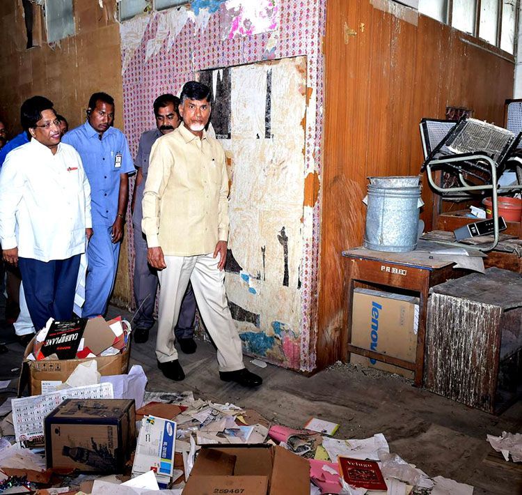 Chief Minister Chandrababu Naidu Friday took a stroll through rooms allotted for AP in L and J bloocks of the Secretariat. The place looks pretty much like a garbage dump or a set for one of Ram Gopal Varma’s fight scenes. Paper, old files, scrap of computer hardware, broken bulbs are strewn all around. No efforts are being made currently to clean up the premises and Naidu is operating from the Lake View Guest House.