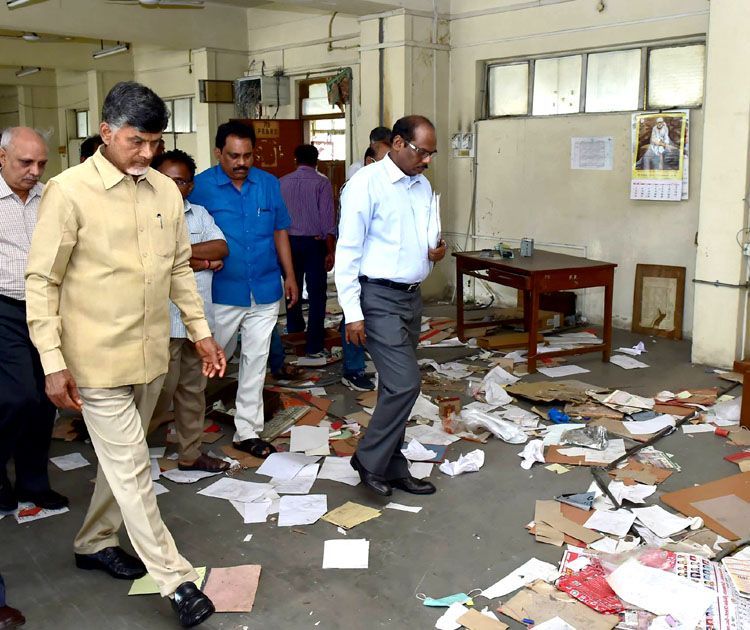 Chief Minister Chandrababu Naidu Friday took a stroll through rooms allotted for AP in L and J bloocks of the Secretariat. The place looks pretty much like a garbage dump or a set for one of Ram Gopal Varma’s fight scenes. Paper, old files, scrap of computer hardware, broken bulbs are strewn all around. No efforts are being made currently to clean up the premises and Naidu is operating from the Lake View Guest House.