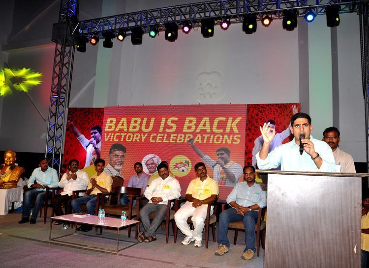 Nara Lokesh participating in victory celebrations of TDP in Andhra Pradesh held at JRC Convention center in Hyderabad on Saturday.