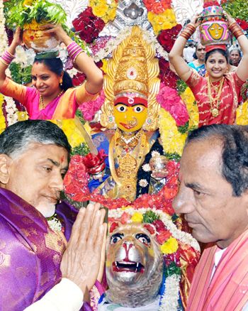 Andhra Pradesh Chief Minister N Chandrababu Naidu, his Telangana counterpart K Chandrasekhar Rao and several other leaders offered prayers at a famous temple in Secunderabad here on the occasion of Bonalu festival.The leaders visited the Sri Ujjaini Mahankali temple which is frequented by thousands of devotees during the festival.