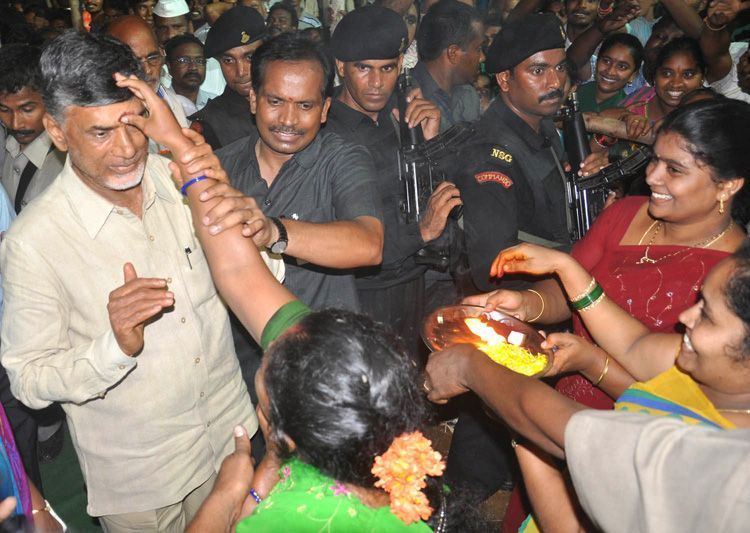 Women extending warm welcome to Chandrababu Naidu by offering Harati and applying tilakam at Ayyappa Swamy temple in Jangareddygudem of West Godavari dist on Wednesday.