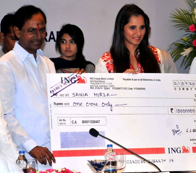 Chief Minister of Telangana K Chndrasekhar Rao presenting a cheque of Rs 1 Cr to teniss star and brand ambassador of Telangana at function held at hotel Grand Kakatiya in Hyderabad.