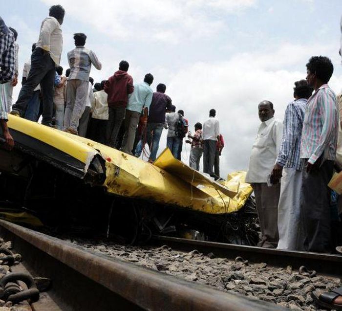 Remnants of the ill fated school bus lying on tracks after it was rammed by Nanded passenger train near Tupran in Medak dist on Thursday. The tragedy occurred around 9 am when the driver of the bus belonging to a private school, ferrying around 40 students, tried to cross the unmanned crossing. The approaching train hit the bus and dragged it for almost a kilometer, killing many students on the spot.