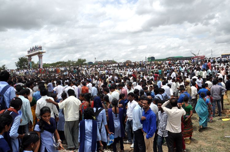 Huge number of people gathers near the mangled remains of the school bus that was rammed by a passenger train at an unmanned railway crossing in Medak district, killing 20 children and the driver on Thursday.