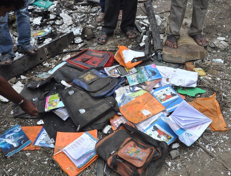 Huge number of people gathers near the mangled remains of the school bus that was rammed by a passenger train at an unmanned railway crossing in Medak district, killing 20 children and the driver on Thursday.