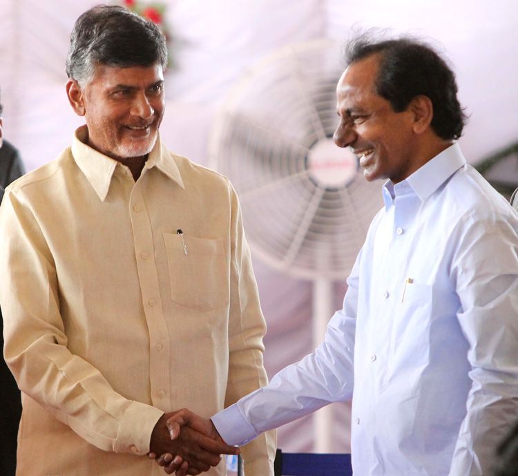 Chief Ministers Chandrababu Naidu and Chandrasekhar Rao met each other and shook hands for the first time after assuming office. They had some lighter moments in the presence of Governor Narasimhan while waiting at Begumpet airport to receive President of India Pranab Mukherjee on Saturday.